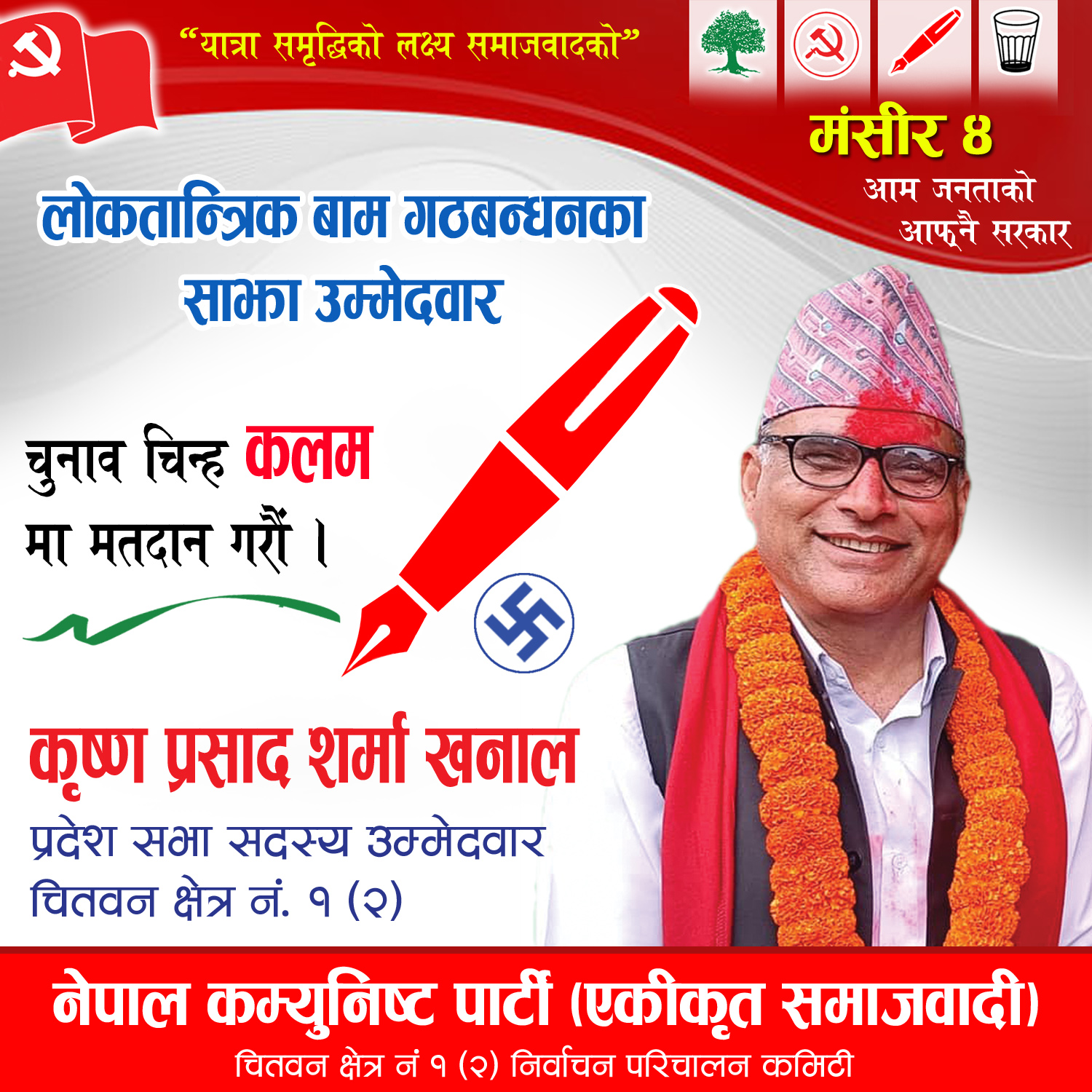 उनले चितवन जिल्ला खेत्र नम्बर १ ख मा प्रदेश सभा सदस्य पदमा कलम चिन्हमा मतदान गर्न समेत सम्पूर्ण मतदाताहरुमा आग्रह गरे ।