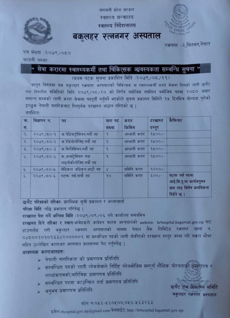 चितवन, २१ मंसिर । पूर्वी चितवनको बकुलहर रत्ननगर अस्पतालले डाक्टर, नर्स सहित विभिन्न पदमा १८ जना स्वास्थ्यकर्मी माग गरेको छ । अस्पतालले आज एक सूचना प्रकाशित गरी करारमा स्वास्थ्यकर्मी तथा चिकित्सक माग गरेको हो ।