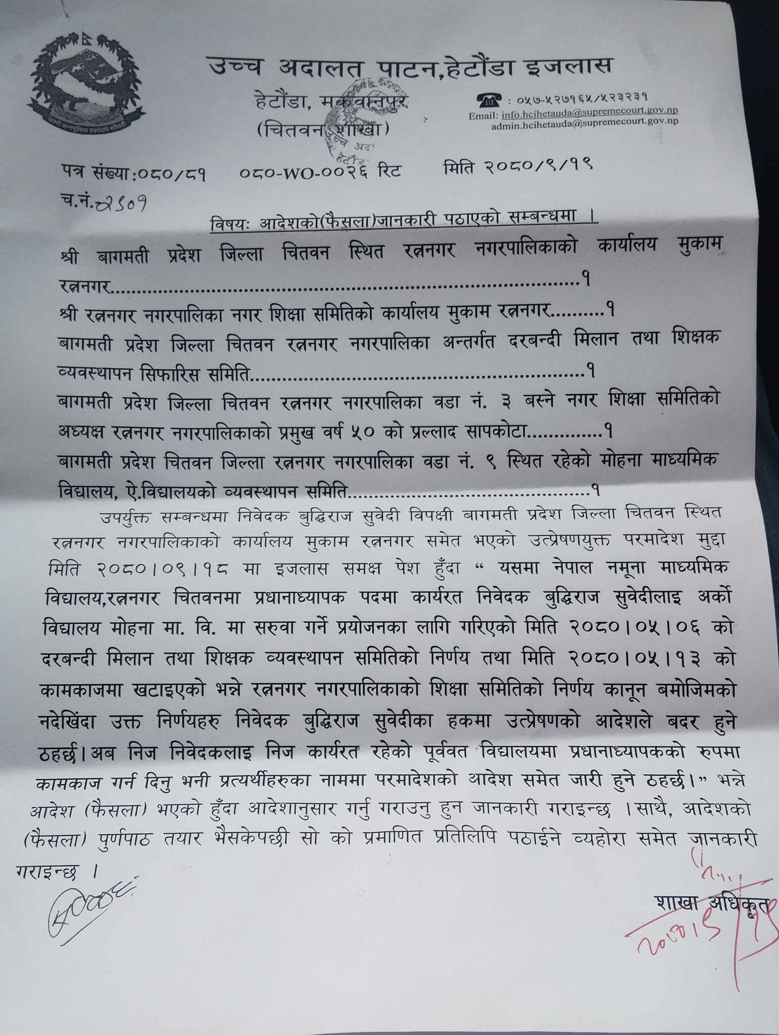 उच्च अदालत हेटौडाले रत्ननगर नगरपालिकाले गरेको प्रधानाध्यापक सरुवाको निर्णय खारेज गरिदिएपछी नगरपालिका सर्वोच्च अदालत जाने भएको छ । उच्च अदालत हेटौडाले केही दिन अघि नेपाल माध्यमिक विद्यालय टॉडीका प्रधानाध्यापक बुद्धिराज सुवेदीको सरुवा कानुन वमोजीम नभएको भन्दै खारेज गरिदिएको थियो । सरुवाको निर्णय खारेज भएपछी कार्यपालिकाको बैठकले सर्वोच्च जाने निर्णय गरेको मेयर प्रलाद सापकोटाले जानकारी दिए । ‘उच्च अदालतको निर्णयलाई सम्मान गर्दै हामीसंग भएको विकल्प अनुसार सर्वोच्च अदालत जाने निर्णय गरेका हौं, सापकोटाले भने ।’
