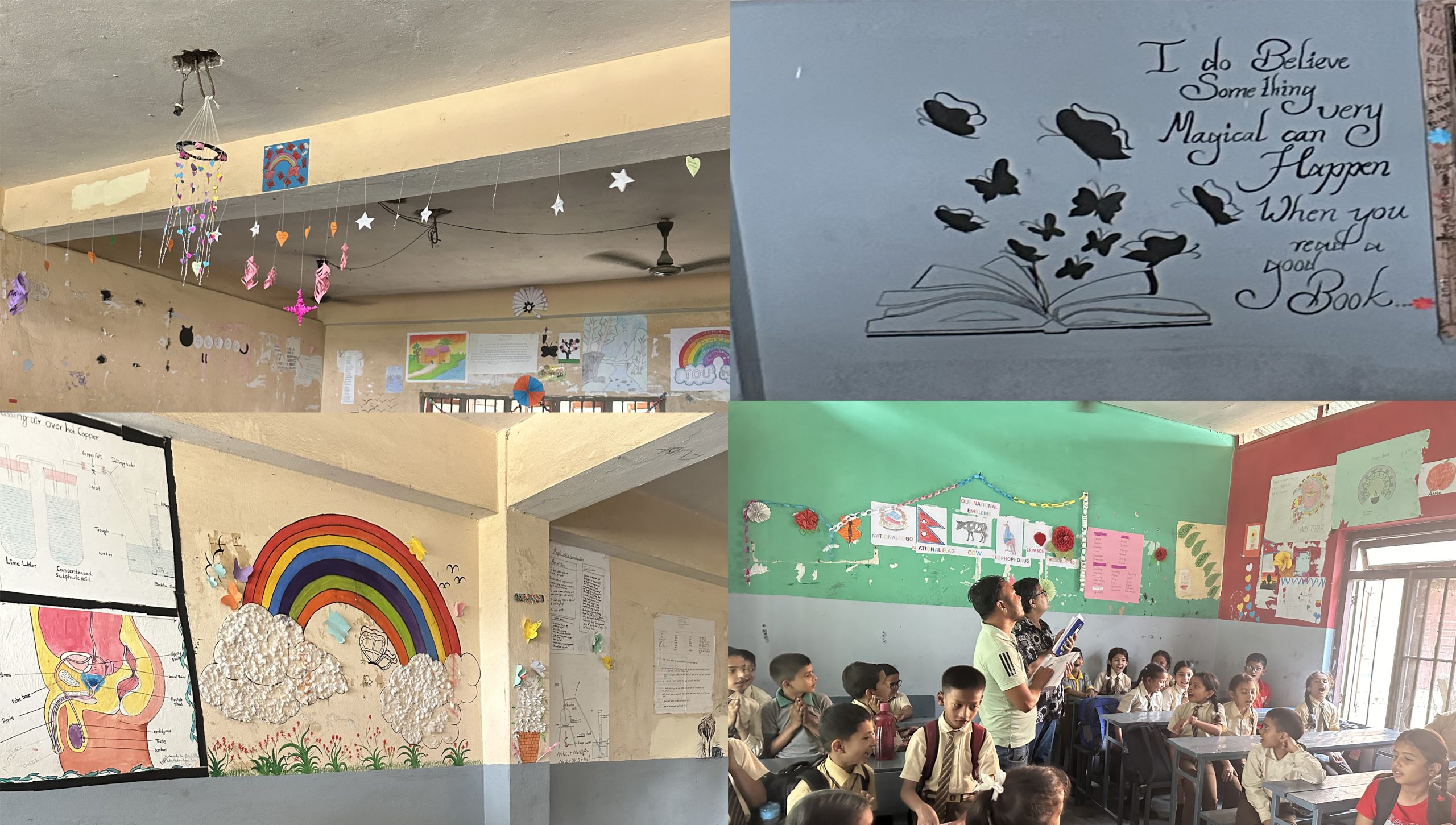 नया वर्ष सुरु भए संगै सुरु भएको नया शैक्षिक सत्रमा यतिबेला विद्यालयहरुमा पठनपाठन सुरुवाती चरणमा रहेको छ । यसै सन्दर्भमा रत्ननगर १० मा रहेको एञ्जल्स वर्ल्ड स्कुलले आज कक्षाकोठा सजावट प्रतियोगिता आयोजना गरेको छ । कागज, रंग साथै विभिन्न सामाग्रीको प्रयोग गरेर कक्षा कोठा सजाउन आज विद्यार्थीहरु व्यस्त देखिन्थे । कक्षा कोठामा कागज बाट निर्मित विविध सिकाईका अर्थ झल्कने तस्विरहरुको दृश्य मनमोहक समेत देखिएको थियो ।